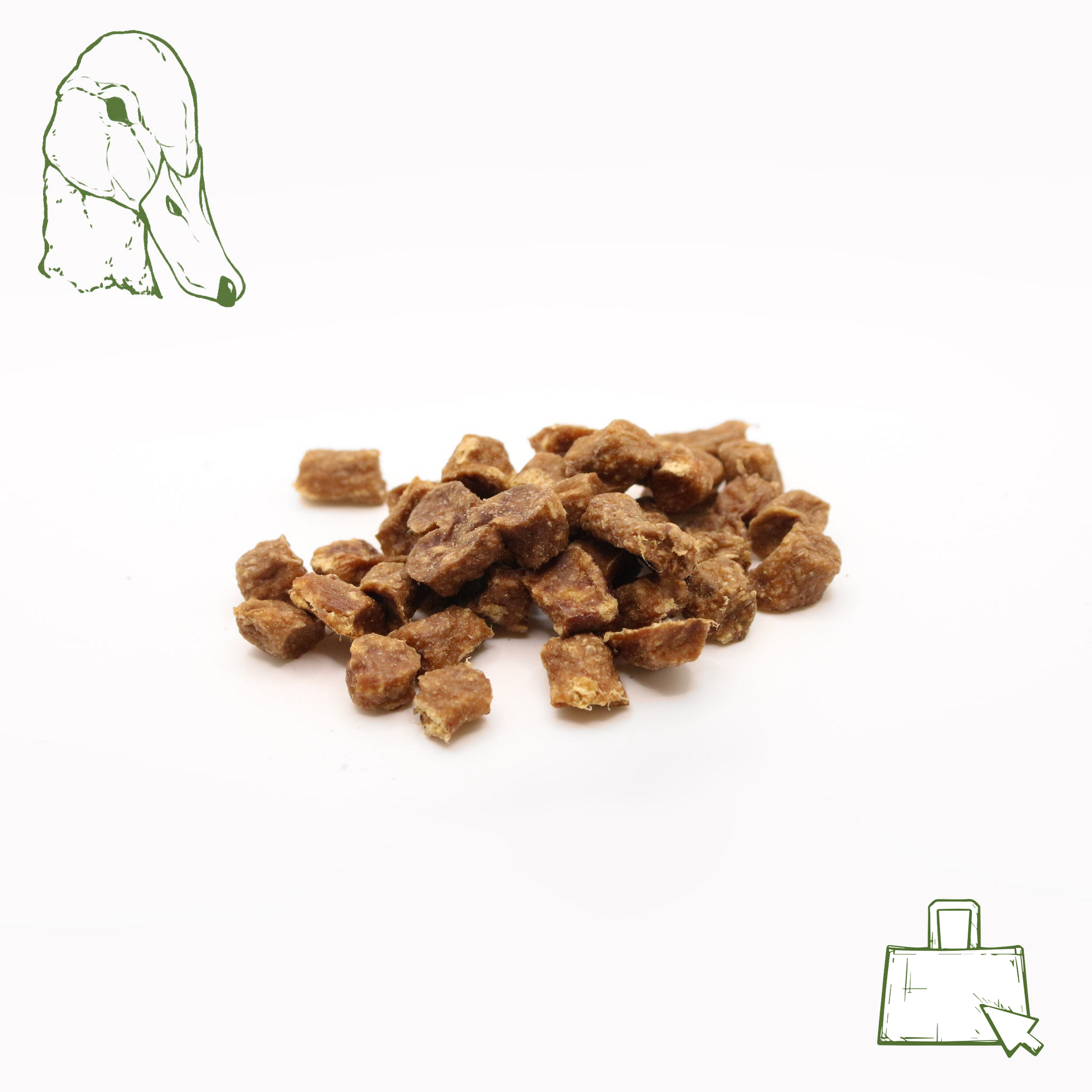 Unsere Entenfleisch Miniwürfel Soft sind weiche Snacks aus reinem Entenfleisch und ideal als Trainingssnack oder Belohnung für zwischendurch geeignet.