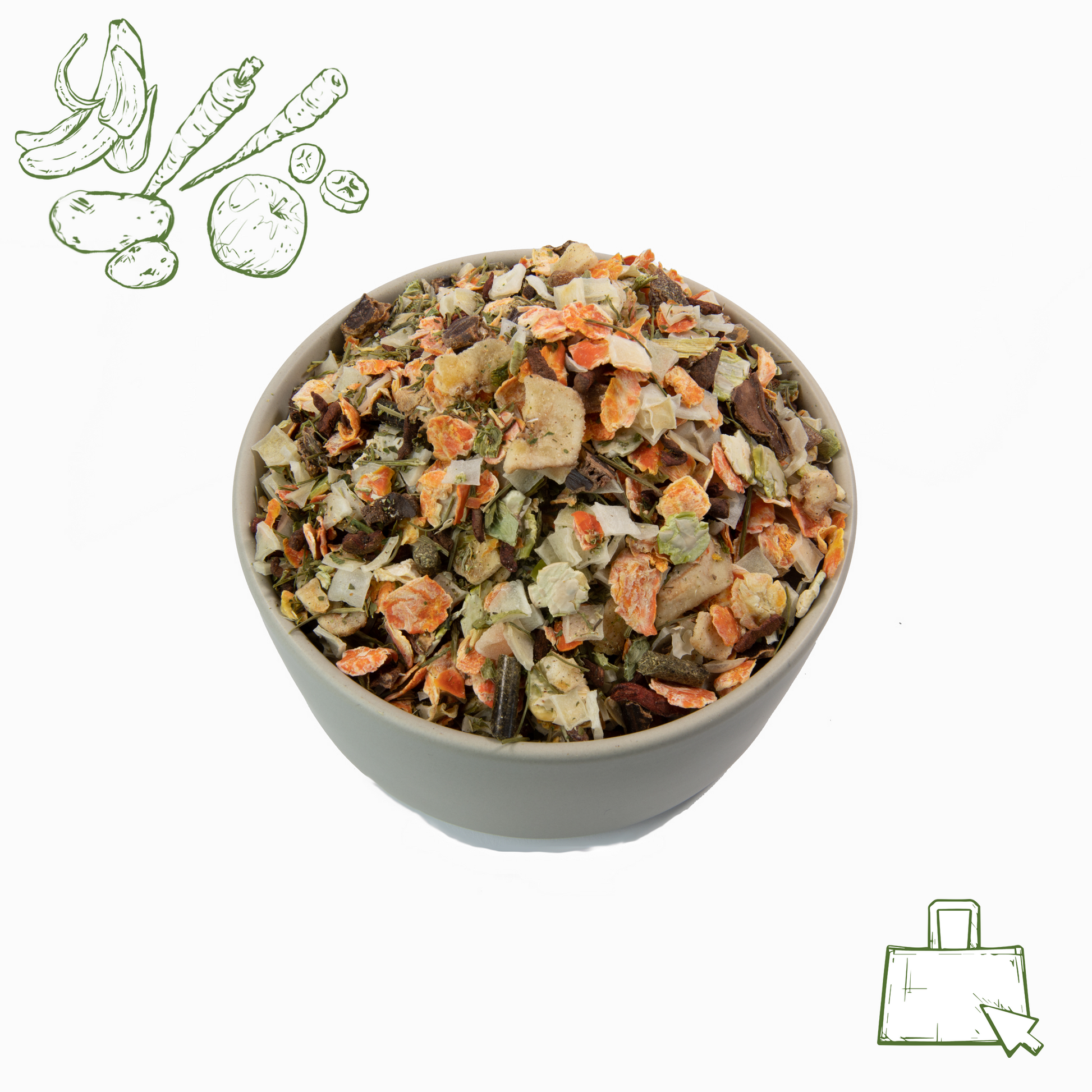 Erbsenflocken getrocknet, Möhrenflocken getrocknet, Luzerne getrocknet, Sellerieflocken getrocknet, Bananen getrocknet, Apfel getrocknet, Rote beete getrocknet, Paprika getrocknet, Kürbisflocken getrocknet, Lauch getrocknet, Kräutermischung getrocknet* (*Brennesselblätter, Enzianwurzel, Tausendgüldenkraut, Beinwellwurzel, Kamillenblüten, Fenchel, Kümmel, Rhabarberwurzel, Kalmuswurzel geschält, Mistelkraut, Schafgarbenkraut, Brombeerblätter, Leinsamen)