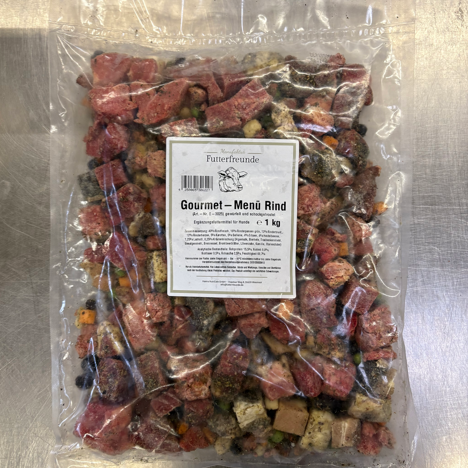 Unser Gourmet-Menü Rind ist ein ausgewogenes Menü aus besten Zutaten, perfekt auf die Bedürfnisse deines Hundes abgestimmt. Es besteht aus hochwertigem Muskelfleisch und Innereien vom Rind, kombiniert mit knackigem Gemüse, Heidelbeeren und einer feinen Kräutermischung. Unsere sorgfältig entwickelte Rezeptur enthält zudem Lachsöl als natürlichen Lieferanten wertvoller Fettsäuren sowie Seealgenmehl zur Jodversorgung. Die Gourmet-Würfel sind nicht nur besonders saftig und stückig, sondern auch einfach zu portionieren.