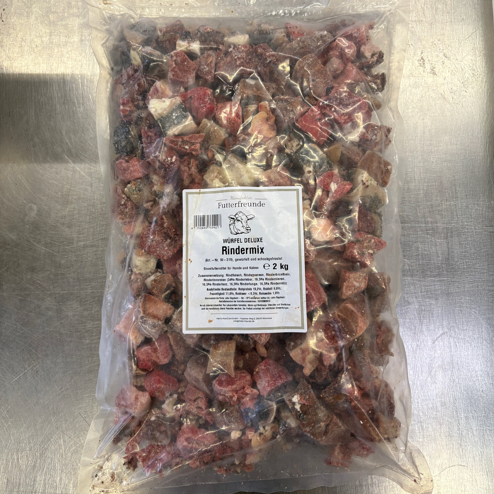 Muskelfleisch (50% Magerfleisch), Rinderinnereienmix (15% Rinderbrust, 5% Leber, 2,5% Lunge, 2,5% Rindermilz, 2,5% Rindernieren, 2,5% Rinderherz geputzt), Rinderpansen (20% Pansen gefroren), RFK (rohe fleischige Knochen)