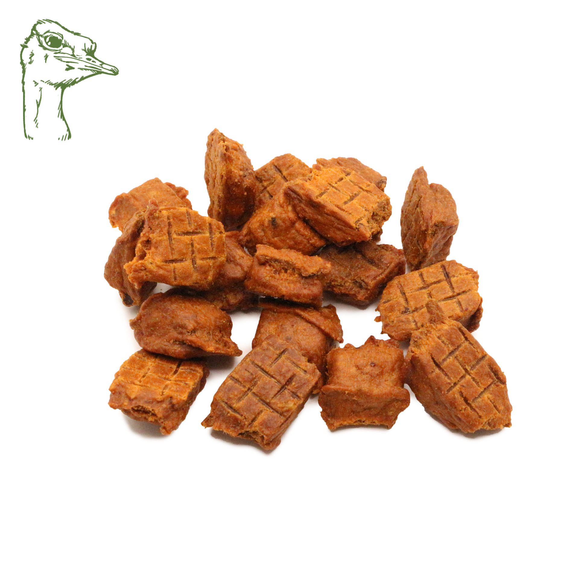Unsere getrockneten Straußenwürfel bestehen aus reinem, fettarmen Muskelfleisch vom Strauß und sind die perfekte Belohnung für Hunde mit Futtermittelunverträglichkeiten. Die handlichen Würfel lassen sich ideal beim Training oder unterwegs einsetzen – sie sind leicht, bekömmlich und werden auch von sensiblen oder wählerischen Hunden gern gefressen. Durch das hypoallergene Monoprotein Strauß eignen sich die Würfel optimal für Ausschlussdiäten.
