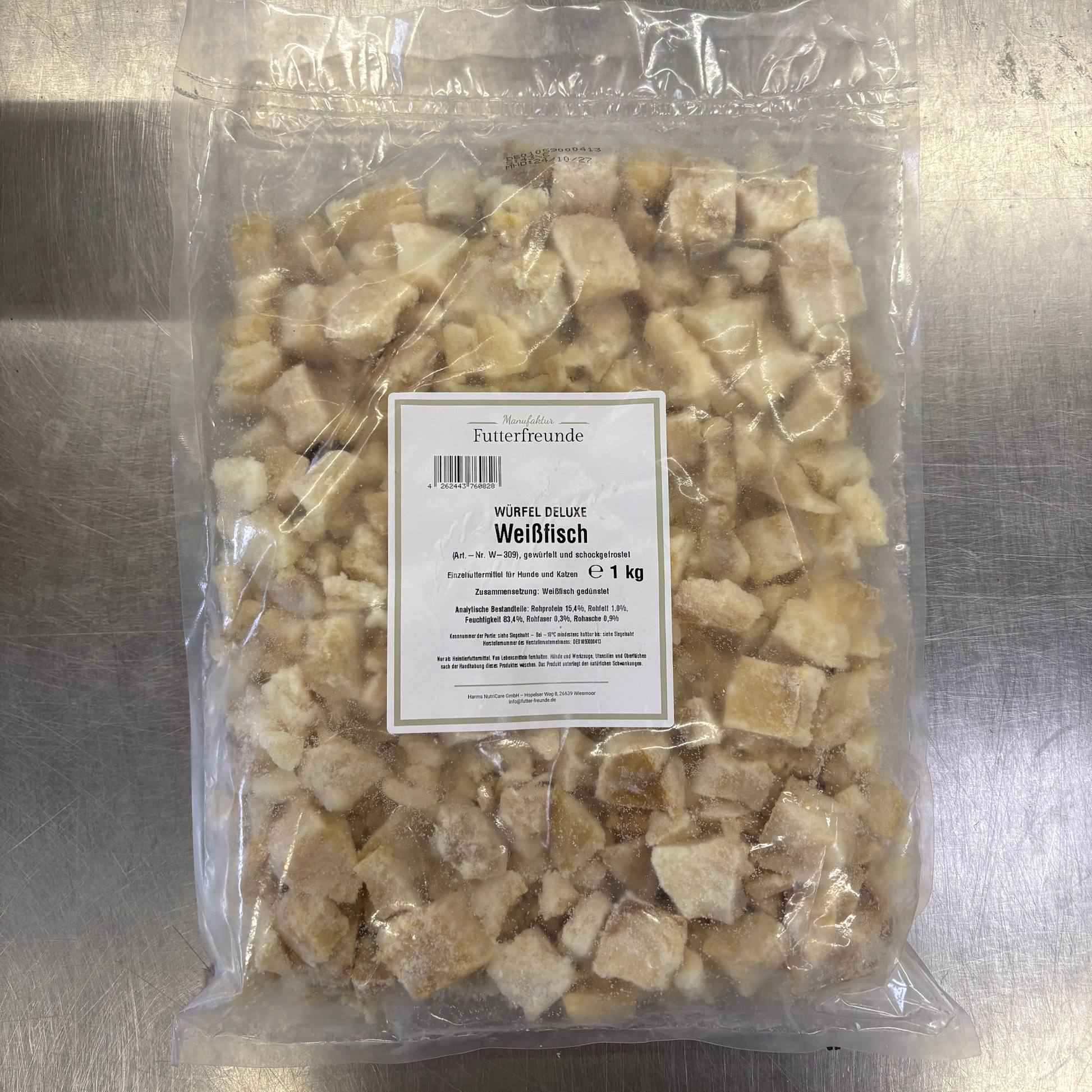 Unser Weißfisch in Würfeln ist eine hochwertige Alternative zu Fleisch und liefert wertvolle Omega-3-Fettsäuren sowie leicht verdauliches Eiweiß. Fisch gilt als eine hervorragende Ergänzung für eine ausgewogene BARF-Ernährung und sorgt für Abwechslung im Napf.